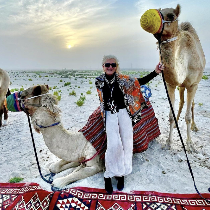 Kiki’s trips changed my life. I went to India twice with Kiki. Sure, we saw the Taj Mahal and Gandhi’s museum. But that was it for mainstream adventures. On the first trip we hung out with King and Queen of Jaisalmer in the desert. A Prince actually gave me pointers on how to ride a camel as we moved through an endless orange desert as the sun was going down. We headed to a gourmet dinner in the sand. We were there for a music festival, amazing shopping for rugs and jewels, and to support the ground breaking of a girls’ school. Our hotel was stunning.