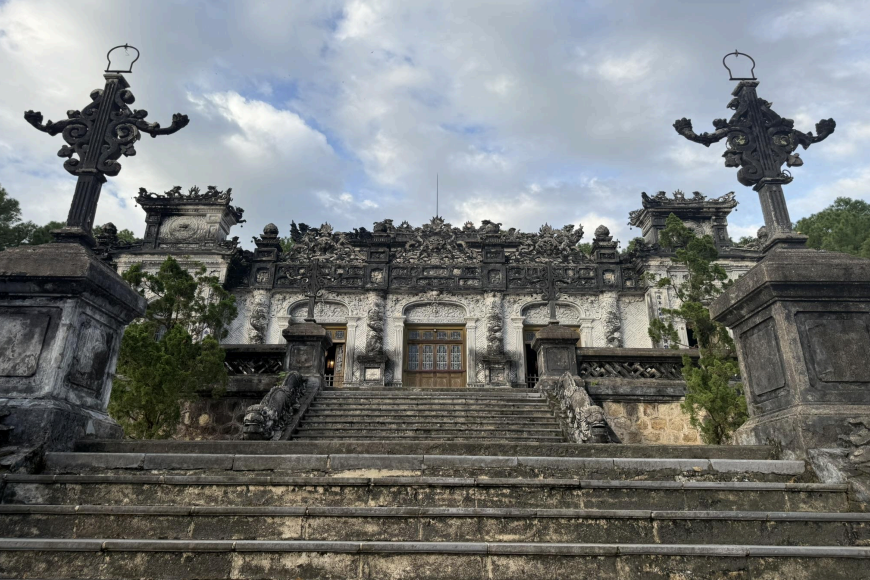 After breakfast, we set out to explore two of Hue’s most significant royal tombs, each offering a very different expression of imperial ideology and aesthetics. We begin with a visit to the Tomb of Minh Mang, considered one of the most harmonious and classically Vietnamese of the Nguyen dynasty tombs. Set within landscaped gardens, lakes, and courtyards, the complex reflects Confucian ideals of balance, hierarchy, and harmony between architecture and nature. We then continue to the Tomb of Emperor Khai Dinh, known for its distinctive blend of Vietnamese and European architectural styles. The tomb’s mosaics, ornate stairways, and panoramic views provide a striking contrast to the traditional imperial design common in Hue.